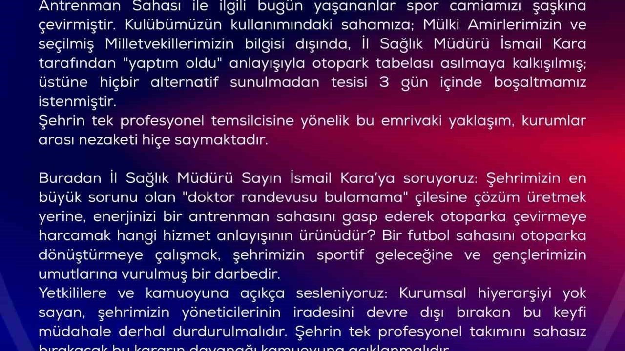 Kulübün, yetkililere çağrıda bulunarak söz konusu müdahalenin durdurulmasını talep ettiği açıklamasında, 'Profesyonel takımımızın çalışmalarını sürdürdüğü Yaşar Kaptan Çebi Antrenman Sahası ile ilgili bugün yaşananlar spor camiamızı hayrete düşürmüştür. Kulübümüzün kullanımındaki sahamıza; Mülki Amirlerimizin ve seçilmiş Milletvekillerimizin bilgisi dışında, İl Sağlık Müdürü İsmail Kara tarafından 'yaptım oldu' anlayışıyla otopark tabelası asılmaya kalkışılmış; üstüne hiçbir alternatif sunulmadan tesisi 3 gün içinde boşaltmamız istenmiştir.