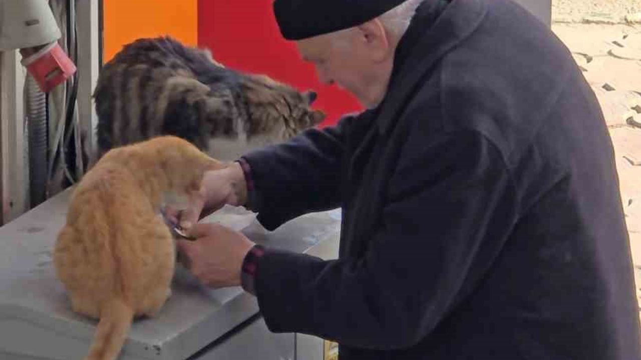 Sürekli sokak kedileri için mama aldığı öğrenilen yaşlı adamın sokak hayvanlarına gösterdiği şefkat ve duyarlılık, izleyenlere yüreklerini ısıttı.